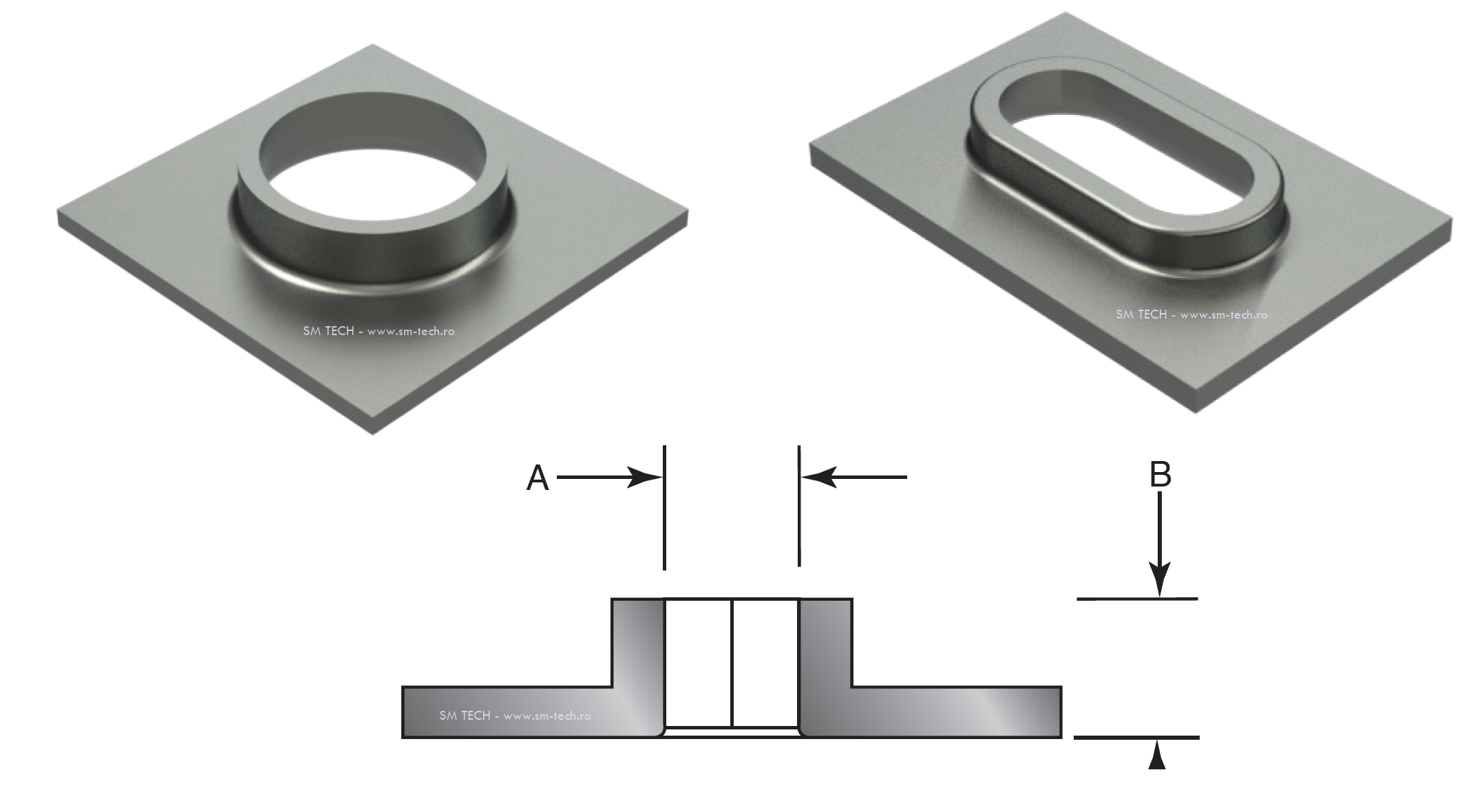 Aplicații:  Deformările EXTRUSION  (găuri cu umeri extrudați / scule extrudare) au ca principal rol deformarea tablei pentru a permite execuția de filete în table cu grosimi mai mici,  ce nu permit filetarea directă în tablă (numarul de spire necesare ale filetului nu ar fi suficiente pentru un filet de calitate);  De asemeni mai rar pot avea  pe piese rol de opritor, element localizare sau ghidare  (ghidare pentru tuburi ventilație de exemplu pentru ca acestea să nu se taie în tablă) , ghidaj pentru a ajuta asamblarea cu altă piesă, element anti-alunecare pe treptele anti-alunecare etc.  Deformările Extrusion pot fi rotunde dar si alte forme (de exemplu oval / oblong etc).  Înainte de aplicarea sculelor extrusion se va aplica o pregăurire. Vom calcula și da către d-voastră diametrul necesar de pre-găurire la fiecare sculă extrusion în parte.